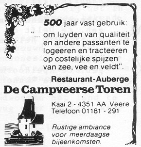 Gerenommeerd restaurant-auberge in Veere. In 1947 is Hendrik Arie van Cranenburgh (gb 1917 Honselersdijk) eigenaar van dit chique etablissement, gelegen aan het Veerse Meer. Het pand dateert van circa 1370 en fungeert dan als bolwerk. Rond 1500 is het een stadsherberg. Volgens de oude Kroniek van Zeeland uit 1696:
