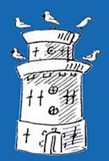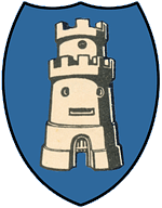 Op blauw een zilveren burcht (motte*) waarop vijf vogeltjes zitten.