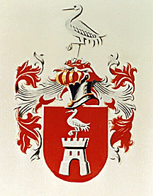 In goud een blauwe kraanvogel. Helm: een kraanvogel ten halve lijve uitkomend van het schild tussen een blauwe vlucht (= 2 vleugels; zijwaards gekeerd).