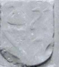Op rood drie kraanvogels in zilver, links gekeerd, 2-1 geplaatst, houdend een steen in de rechter opgheven poot. Foto rechts: een afbeelding op een grafzerk.