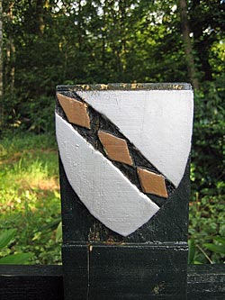 Op goud zeven kepers in rood. De twee bovenste verdwijnend in de bovenrand. In vrijkwartier (broek): op blauw een staande kraanvogel in zilver. Geen steen in de poot!