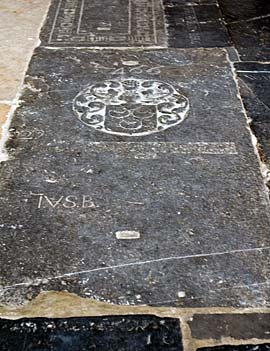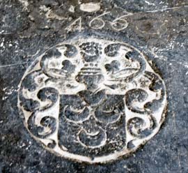 Op rood drie kraanvogels in zilver, links gekeerd, 2-1 geplaatst, houdend een steen in de rechter opgheven poot. Foto rechts: een afbeelding op een grafzerk.